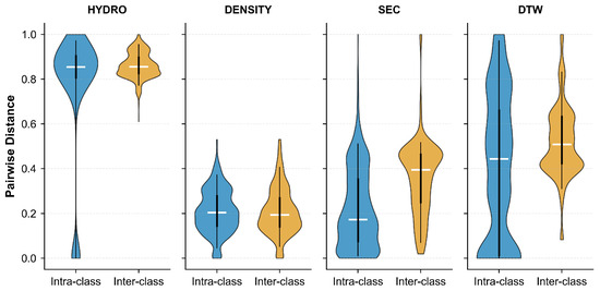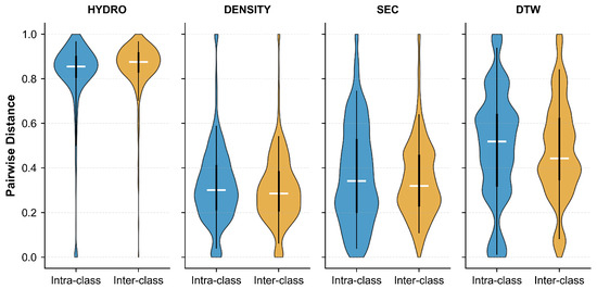 Figure 8 presents the pairwise distance distributions for four different features: Hydrophobicity (HYDRO), Density (DENSITY), Secondary Structure (SEC), and DTW-based distance (DTW). The violin plots compare intra-class distances (blue) against inter-class distances (yellow) for each feature. Ideally, effective features should exhibit small intra-class distances and large inter-class distances to ensure good separability. As shown in the figure, HYDRO and SEC demonstrate relatively well-separated distributions, with inter-class distances substantially larger than intra-class distances. In contrast, DENSITY and DTW show considerable overlap between the two distributions, indicating limited discriminative power for these features.