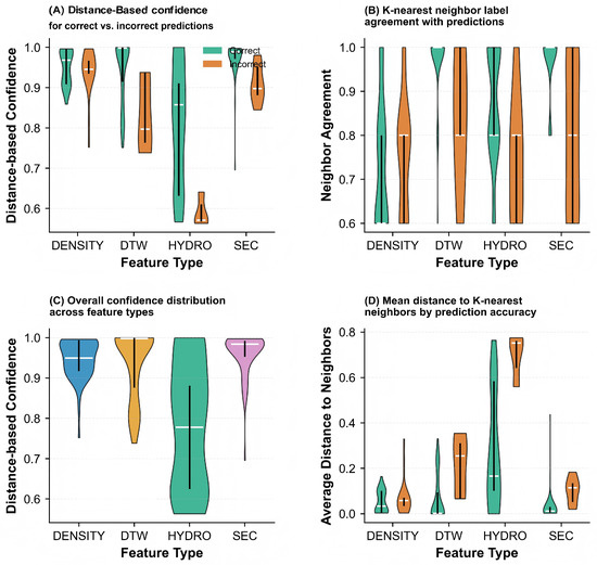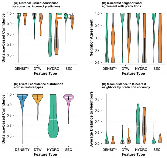 Figure 14 provides a comprehensive evaluation of prediction reliability across the complete dataset. Panel (A) presents the distance-based confidence scores, where accurate predictions (green) consistently achieve higher confidence values than erroneous predictions (orange) for all features, though the margin varies. Notably, HYDRO exhibits the most pronounced separation between correct and incorrect predictions, indicating its robustness in confidence estimation. Panel (B) displays the K-nearest neighbor label agreement distribution, revealing that accurate predictions generally correspond to higher neighbor agreement, particularly for HYDRO and DTW features. Panel (C) compares the overall confidence distributions across feature types, showing that DENSITY and DTW maintain relatively stable high-confidence regions, while HYDRO demonstrates broader variability, with a substantial proportion of samples exhibiting lower confidence scores. Panel (D) examines the mean distances to K-nearest neighbors, where correctly classified samples tend to have smaller average neighbor distances across all features, confirming that accurate predictions typically reside in more homogeneous regions of the feature space.