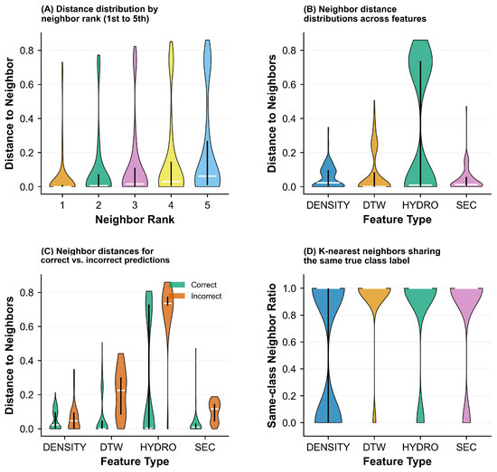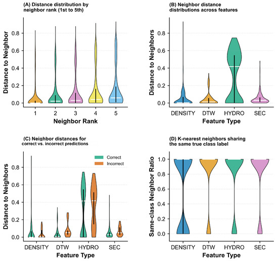 Figure 15 further investigates the neighborhood structure characteristics in the complete dataset. Panel (A) depicts the distance progression from the first- to the fifth-nearest neighbor, demonstrating a gradual increase in distance with neighbor rank across all features. The relatively smooth progression suggests well-structured local neighborhoods in the feature spaces. Panel (B) compares the magnitude of neighbor distances across features, revealing that HYDRO produces substantially larger distances compared to other features, which may reflect its different scaling properties or the higher dimensionality of its representation. Panel (C) analyzes the relationship between prediction correctness and neighbor proximity, showing that for HYDRO and DTW, incorrect predictions (orange) are often associated with larger neighbor distances, indicating that misclassified samples tend to be outliers or located in sparse regions. In contrast, DENSITY and SEC show more compact distance distributions regardless of prediction accuracy, suggesting that distance alone may not be a reliable indicator of prediction quality for these features. Panel (D) presents the proportion of same-label neighbors (same-class neighbor ratio), where all features achieve predominantly high ratios above 0.8, demonstrating that the K-nearest neighbor approach effectively captures local class structure even in the more complex complete dataset.
