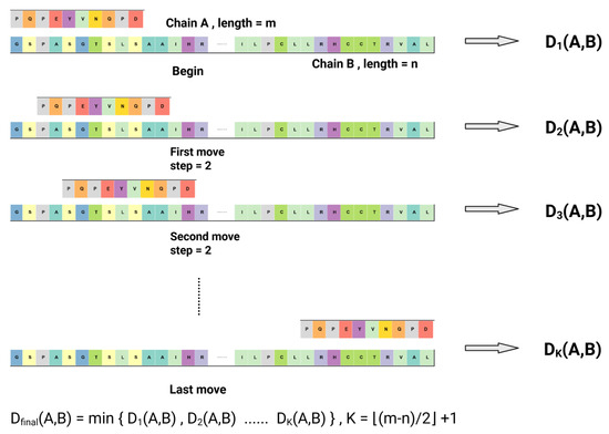 where and denote the density of the k-th PTM type for protein chains and , respectively; n is the total number of PTM types considered (here, ); and p is the order of the norm (with corresponding to the norm used in this study).