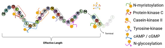 Post-translational modification (PTM) sites and effective length. The diagram shows a protein sequence where specific residues undergo PTMs. These modifications are decoded by the legend on the right and include N-myristoylation (M), protein-kinase C phosphorylation (C), casein-kinase II phosphorylation (K), tyrosine-kinase phosphorylation (Y), cAMP/cGMP-dependent protein-kinase phosphorylation (P), and N-glycosylation (G). The ‘effective length’ is defined as the sequence span between the first and last detected PTM site. Residues outside this range (Terminal, faded) are excluded from the analysis, focusing on the functionally relevant region.