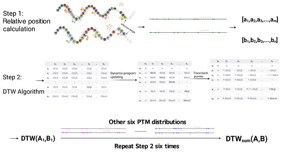 Specifically, for protein A and protein B with relative PTM position sequences and , the DTW cost matrix D is recursively defined as