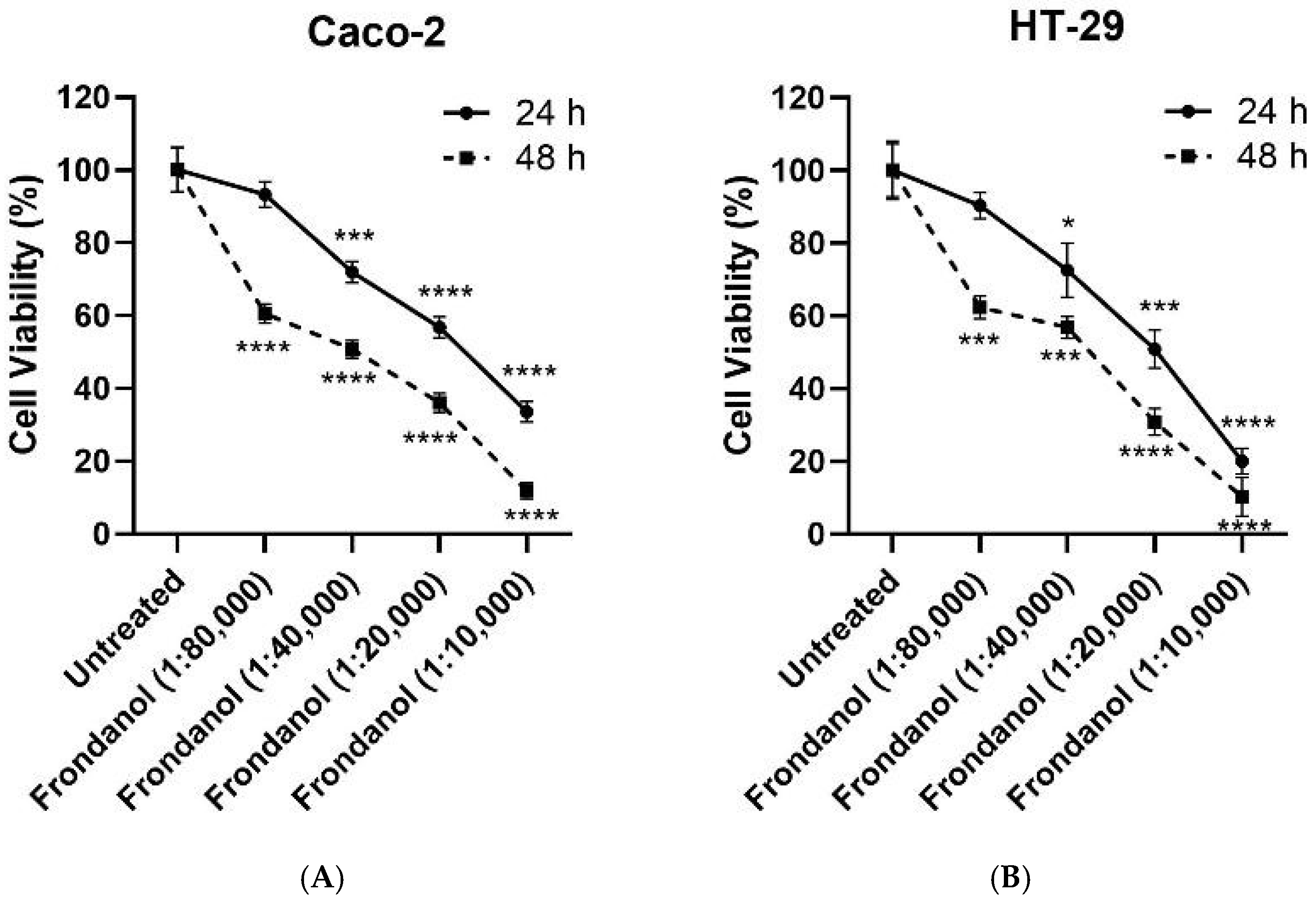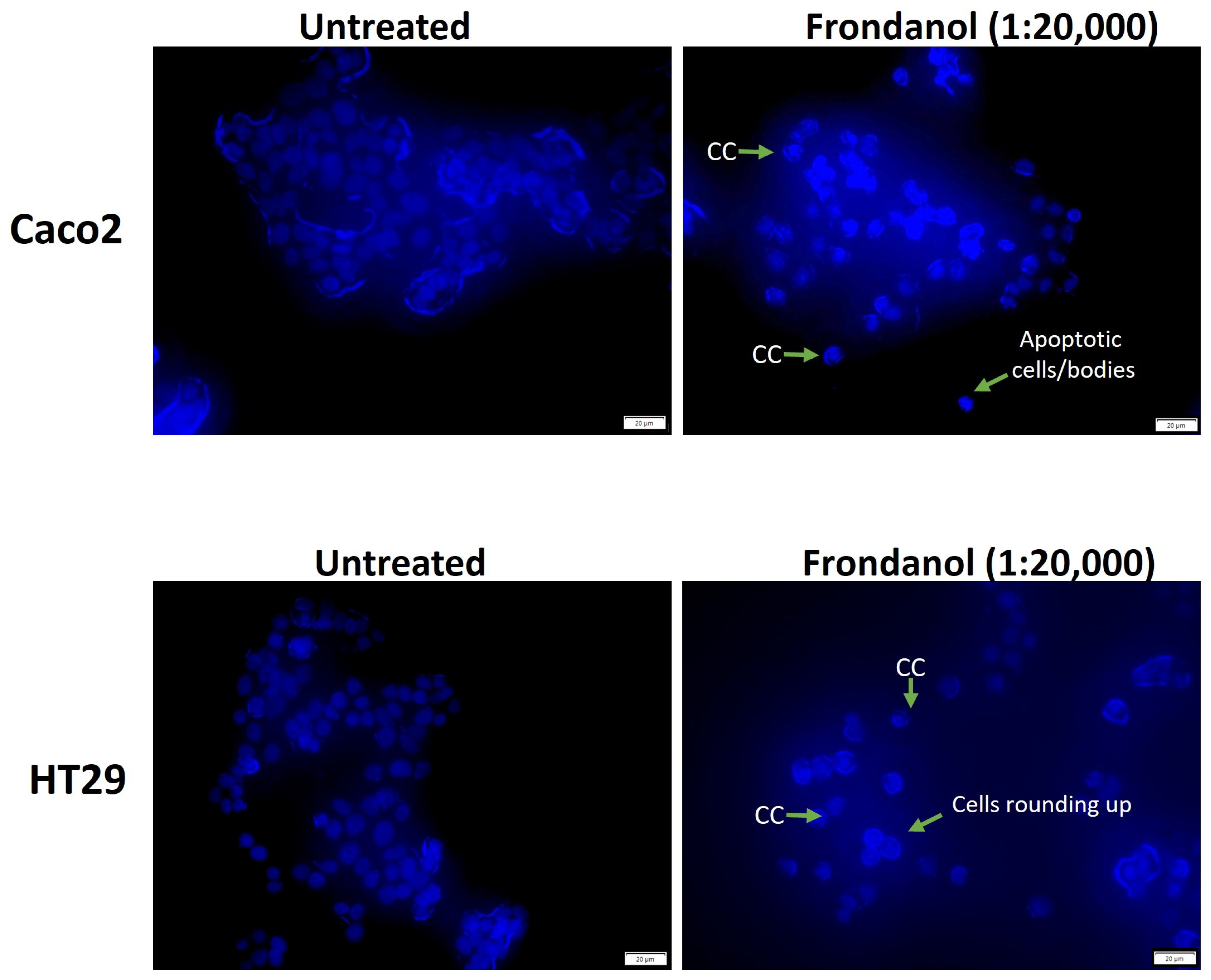 2.2. Frondanol Suppressed Colon Cancer Cell Proliferation in a Dose-Dependent Manner