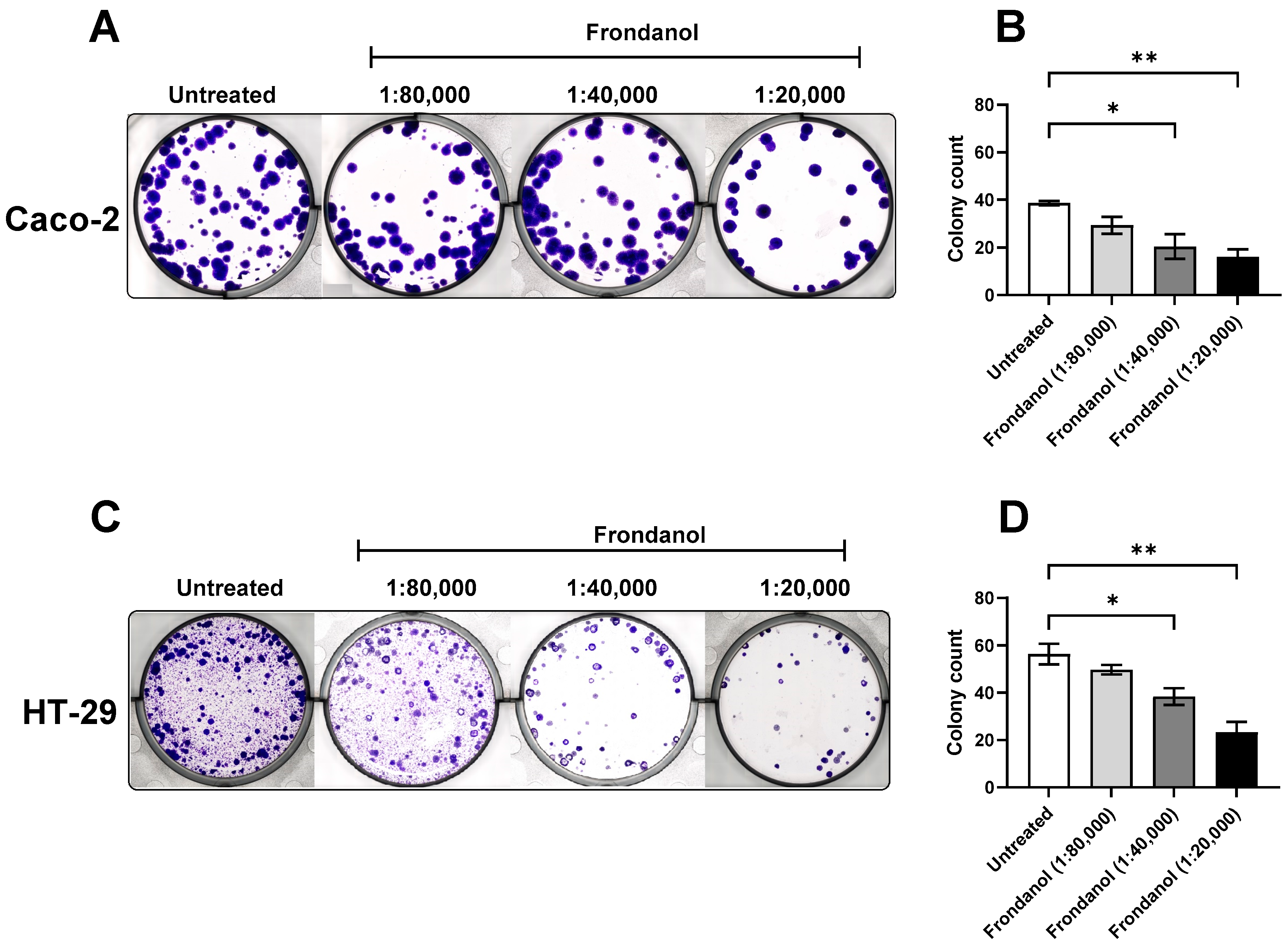 2.3. Frondanol Reduced CRC Cell Lines’ Clonogenic Ability