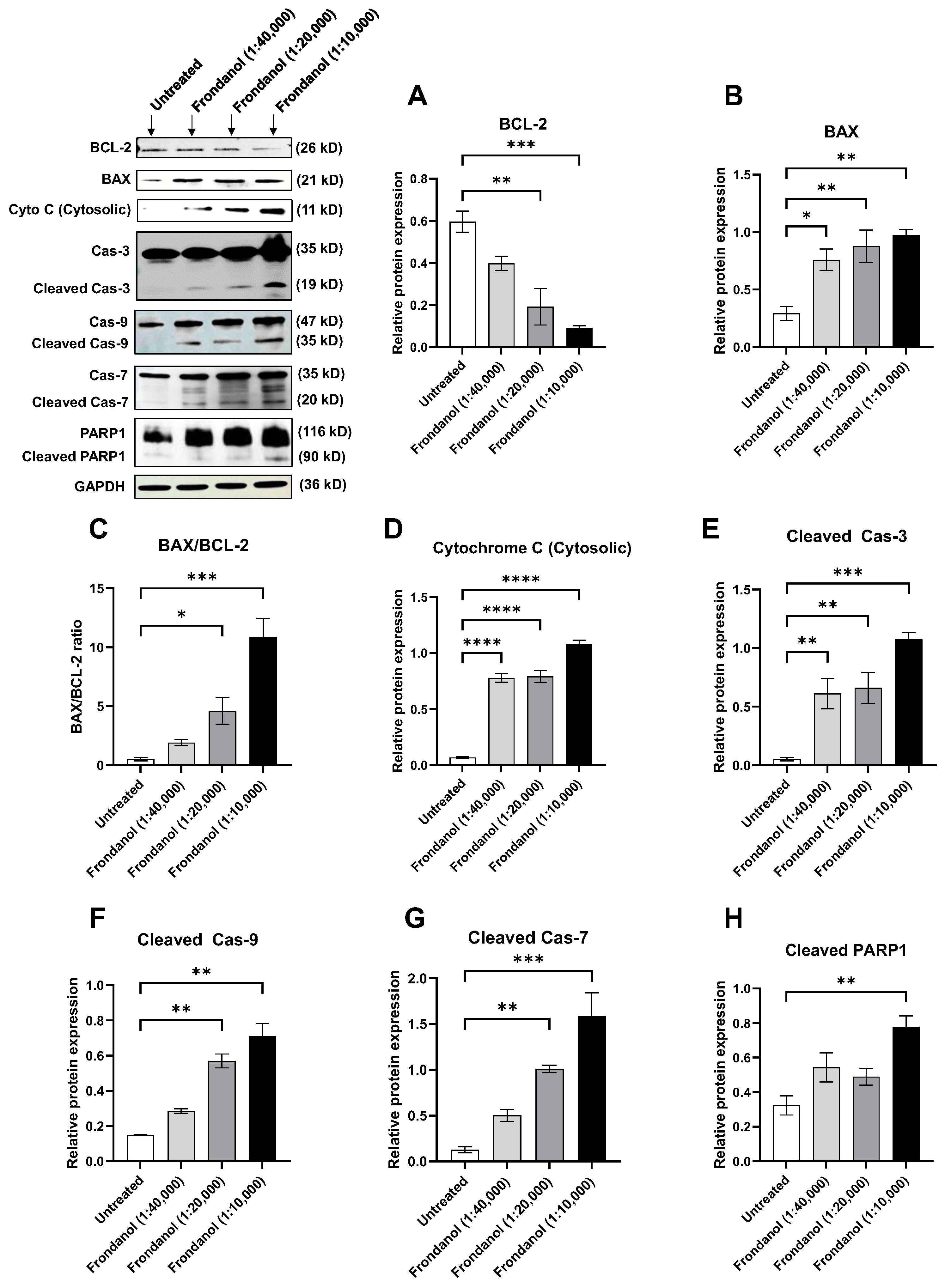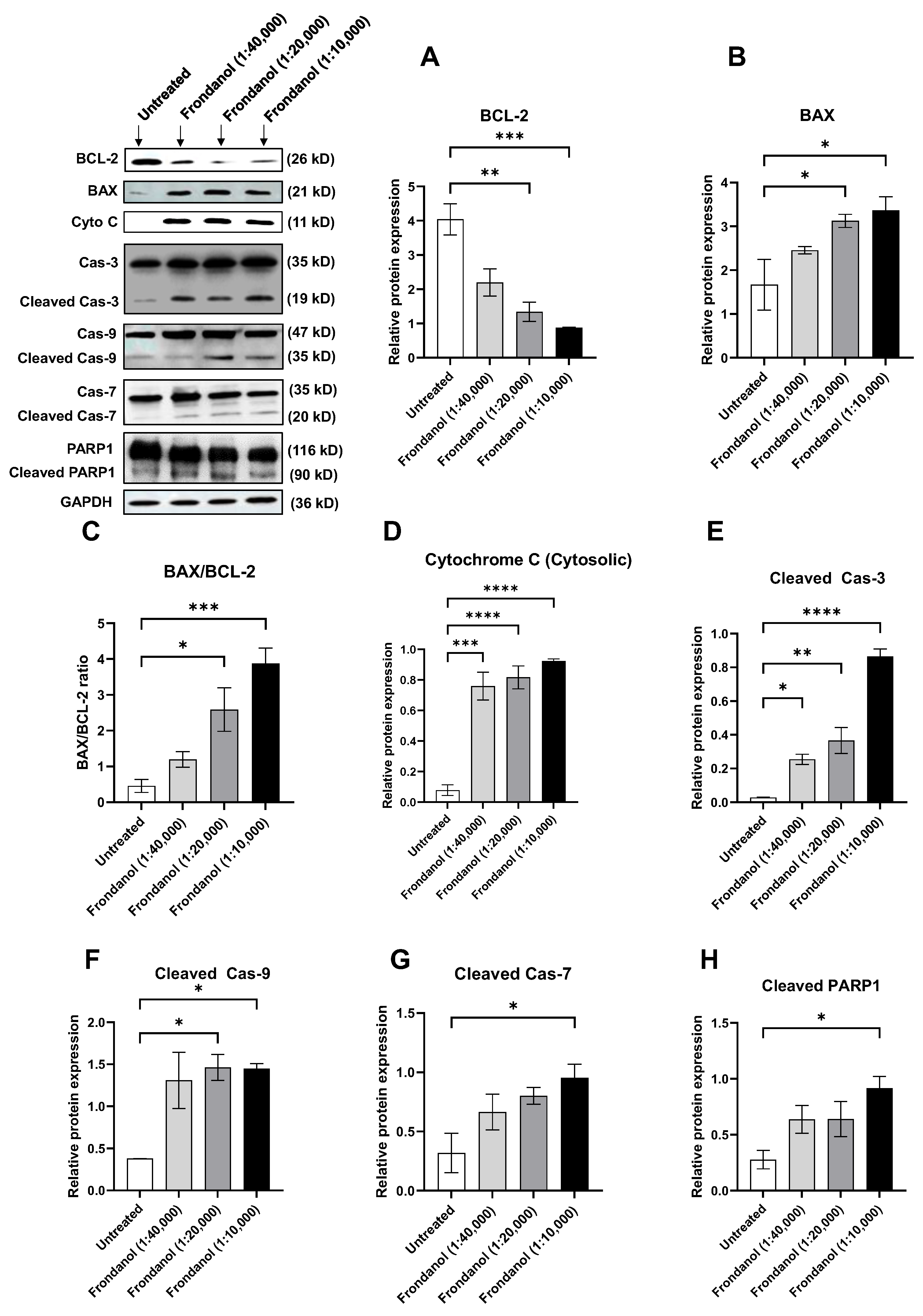 2.9. Frondanol Modulated Anti-Apoptotic, Pro-Apoptotic, and Caspase Protein Expression