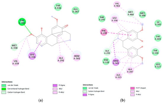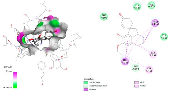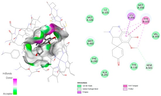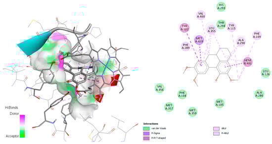 According to Hargrove et al. in 2011 [], the active site involved the amino acids Leu355, Met357, Leu358, Met459, Val212, Phe104, Met105, Tyr115, Ala114, Ala286, Phe109, Gly282, Met283, Phe289, Leu129, Ala290, and Val460. Reticuline was found to establish hydrogen bonds with Met357 and Ala286 (Figure 7), both involved in the active site. Additionally, for this complex, π–π T-shaped with Phe109, π–σ interaction with Leu355, and Van der Waals and alkyl interactions with the amino acid residues Hem371, Leu358, Val 460, Val356, Leu358, Met359, Tyr102, Ala287, Met283, Ala290, Met205, Tyr115, Phe289, and Leu126 were observed. Wilsonirine demonstrated π–π T-shaped interaction with Hem481 and Tyr102 (Figure 8), besides hydrophobic interaction in the active site, van der Waals and alkyl interactions were observed mainly with Val460, Phe109, Val356, Leu355, Ala286, Leu358, Met359, Tyr102, Ala287, Met283, Ala290, Met205, Tyr115, Met357, Phe289, and Leu126, all involved in the active site [].