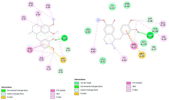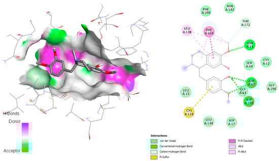 The docking interaction of the co-crystallized ligand KRM demonstrated π–σ interaction with Leu138, π–π interaction with Phe200, Phe204, and Phe169 (Figure S2). On the other hand, different hydrophobic interactions in the active site were observed, mainly van der Waals and alkyl interactions with the amino acids Leu15, Leu39, Ser64, Gly63, Cys12, Asn13, Asn142, Thr172, and Phe205. The reticuline and co-crystallized ligand KRM share some residues, Phe169, Leu138, and Phe200, involved in the active site, according to Kuettel et al., 2011 [].