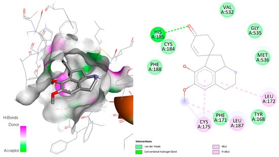 Plasmodium species can only access de novo-synthesized pyrimidines. According to Pippione et al., 2019 [], the active site of this enzyme contains numerous amino acid residues, including Tyr168, Phe171, Leu172, Ile176, Leu187, Phe188, Tyr528, Phe227, Phe188, Cys175, Leu531, Ile263, His185, Ile272, Arg265, and Met536. The P. falciparum_DHODH-jacularine complex demonstrated hydrogen with His185, similar to the result obtained by Pippione et al. []. In addition, different hydrophobic interactions in the active site were observed, mainly van der Waals and alkyl interactions with the amino acids Val532, Cys184, Phe188, Gly535, Met536, Leu172, Tyr168, Leu187, Phe171, and Cys175 (Figure 11).