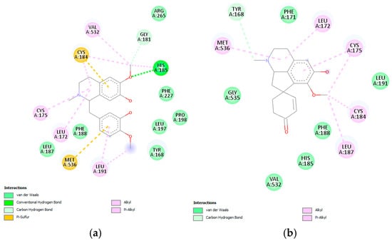 Reticuline and linearisine demonstrated similar interactions like jacularine (Figure 12); however, only the reticuline was found to establish hydrogen bonds with His185, and π–sulfur interactions with Cys184 and Met536 were observed (Figure 12a). On the other hand, linearisine demonstrated no hydrogen bond interactions; however, it exhibits several hydrophobic interactions, as van der Waals interactions with the Gly535, Phe171, Leu191, Phe188, His185, and Val532, alkyl and π–alkyl interactions with Met536, Leu172, Cys175, Cys184, Leu187 residues (Figure 12b). Reticuline and linearisine share several amino acids—Phe171, Leu172, Leu187, Phe188, Phe188, and Met536—involved in the active site of the P. falciparum DHODH enzyme.