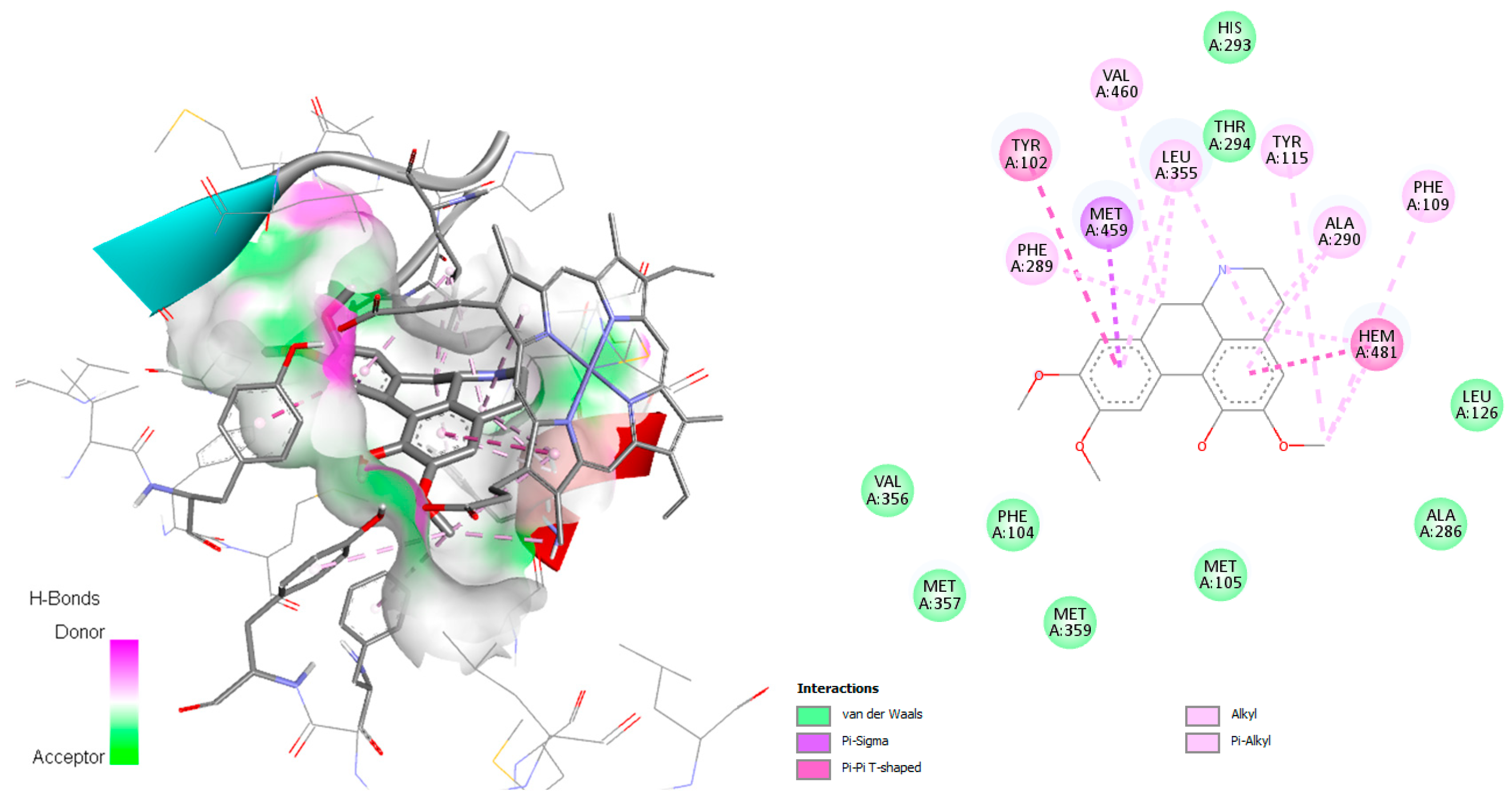 Figure 7), both involved in the active site. Additionally, for this complex, π–π T-shaped with Phe109, π–σ interaction with Leu355, and Van der Waals and alkyl interactions with the amino acid residues Hem371, Leu358, Val 460, Val356, Leu358, Met359, Tyr102, Ala287, Met283, Ala290, Met205, Tyr115, Phe289, and Leu126 were observed. Wilsonirine demonstrated π–π T-shaped interaction with Hem481 and Tyr102 (