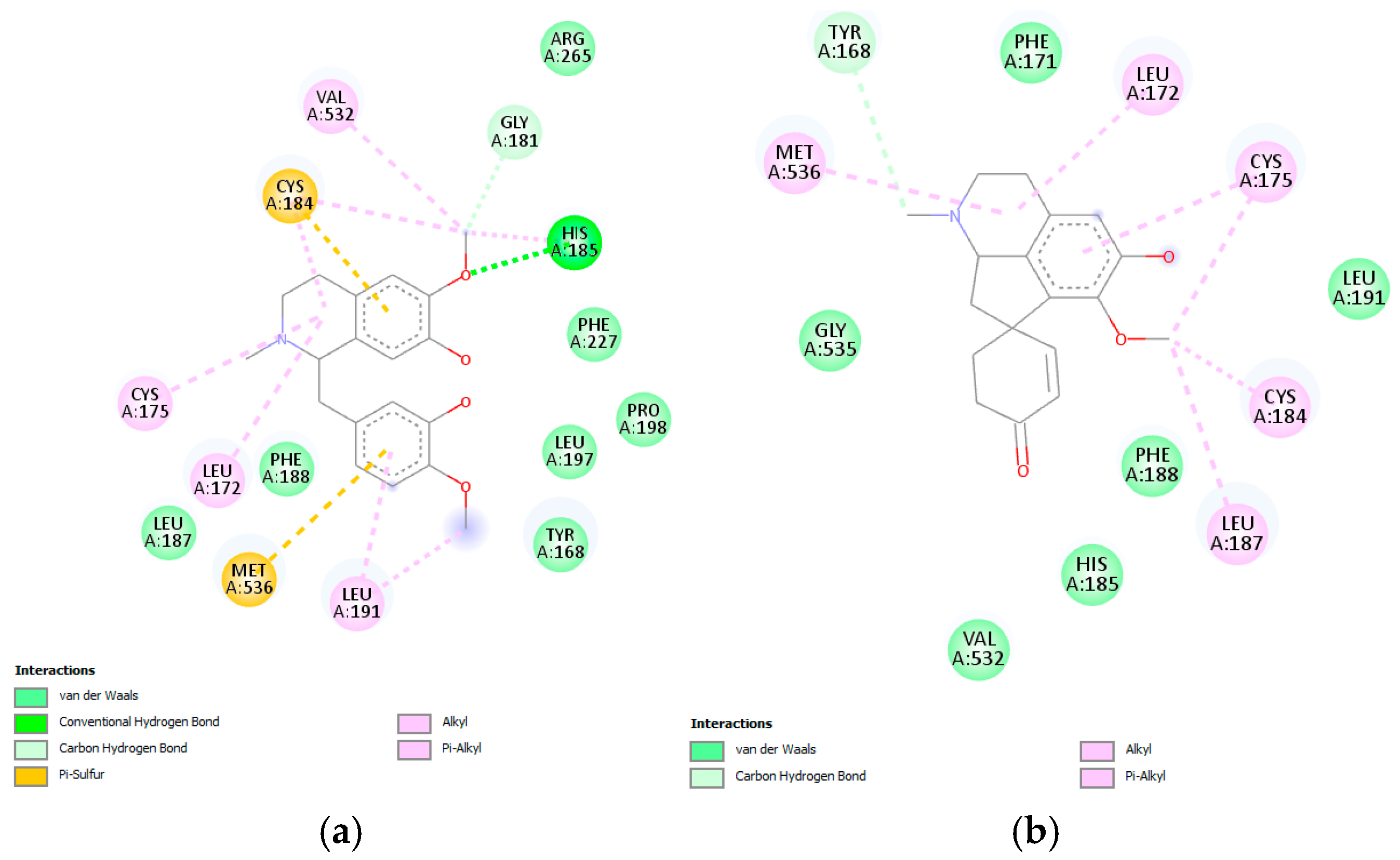 Figure 12); however, only the reticuline was found to establish hydrogen bonds with His185, and π–sulfur interactions with Cys184 and Met536 were observed (
