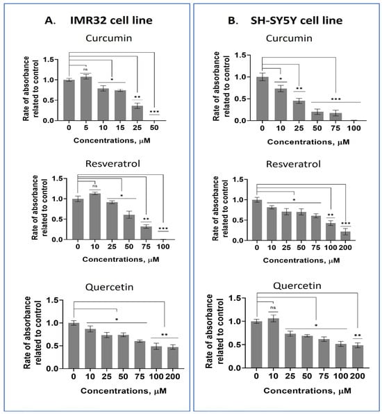 Curcumin, resveratrol, and quercetin suppress neuroblastoma cell lines. (A) IMR32 cell line. (B) SH-SY5Y cell line. MTT data are shown. A Mann–Whitney U-test was applied to check for statistically significant differences. * p ≤ 0.05; ** p ≤ 0.01; *** p ≤ 0.001; ns—nonsignificant.