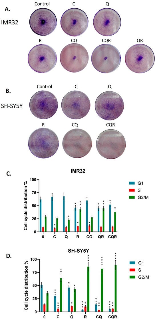 Dietary polyphenols and their combinations inhibit the growth and cell cycle of neuroblastoma cell lines. (A) and (B) Crystal violet assay and cell cycle assay of (C) IMR32 and (D) SH-SY5Y cell lines treated with both individual polyphenols and their combinations. Student’s t-test was applied to check pairwise statistically significant differences. * p ≤ 0.05; ** p ≤ 0.01, *** p ≤ 0.001. C—curcumin, Q—quercetin, R—resveratrol, CQ—curcumin with quercetin, QR—quercetin with resveratrol, and CQR—curcumin with quercetin and resveratrol.