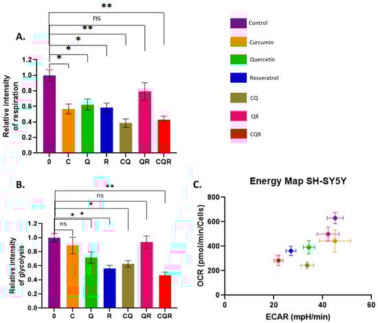 Dietary polyphenols and their combinations suppress glycolysis and respiration in SH-SY5Y cells. SeaHorse Data. The diagrams illustrate the intensity of (A) respiration and (B) glycolysis. (C) The energy diagram reflects the intensity of glycolysis (ECAR) and respiration (OCR). OCR—Oxygen Consumption Rate (shows respiration); ECAR—Extracellular Acidification Rate (shows glycolysis). A Mann–Whitney U-test was applied to check for statistically significant differences. * p ≤ 0.05; ** p ≤ 0.01; ns—nonsignificant. C—curcumin, Q—quercetin, R—resveratrol, CQ—curcumin with quercetin, QR—quercetin with resveratrol, and CQR—curcumin with quercetin and resveratrol.
