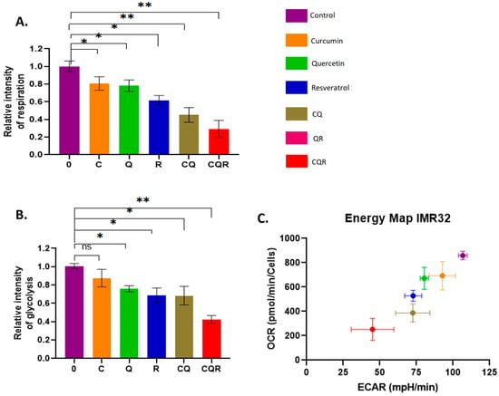 Dietary polyphenols and their combinations suppress glycolysis and respiration in IMR32 cells. SeaHorse Data. The diagrams illustrate the level of (A) respiration and (B) glycolysis. (C) The energy diagram reflects the intensity of glycolysis (ECAR) and respiration (OCR). OCR—Oxygen Consumption Rate (shows respiration); ECAR—Extracellular Acidification Rate (shows glycolysis). A Mann–Whitney U-test was applied to check for statistically significant differences. *p ≤ 0.05; ** p ≤ 0.01; ns—nonsignificant. C—curcumin, Q—quercetin, R—resveratrol, CQ—curcumin with quercetin, and CQR—curcumin with quercetin and resveratrol.