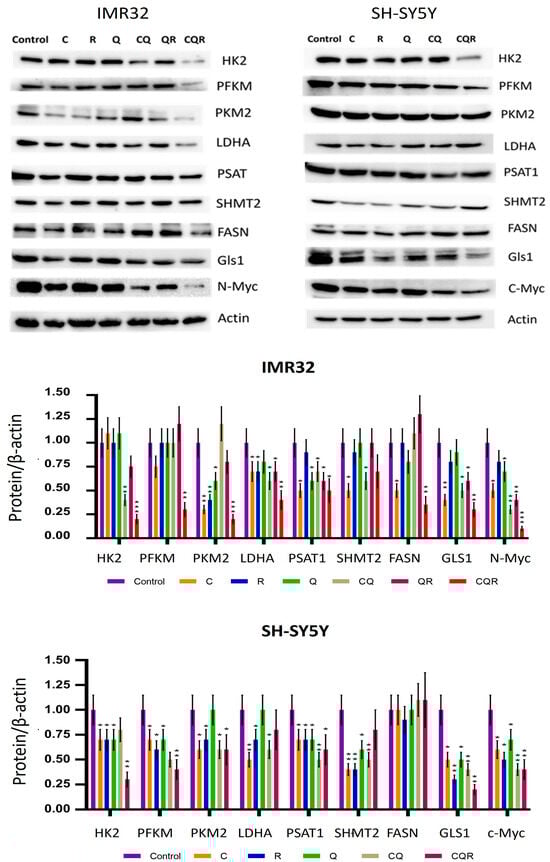 Polyphenols and their combinations suppress the key enzymes involved with glycolysis (HK2, PFKM, PKM2, LDHA), one-carbon metabolism (PSAT1, SHMT2), de novo fatty acids biosynthesis (FASN), glutaminolysis (GLS1), and their important transcriptional regulators (N-Myc, c-Myc) at the protein level (Western blot) in IMR32 and SH-SY5Y neuroblastoma cell lines. The diagrams show the results of quantification performed using Image J software (Version 1.54p). Student’s t-test was used to determine pairwise statistically significant differences. Asterisks represent a significant difference in protein expression (* p ≤ 0.05; ** p ≤ 0.01; *** p ≤ 0.001). C—curcumin, Q—quercetin, R—resveratrol, CQ—curcumin with quercetin, QR—quercetin with resveratrol, and CQR—curcumin with quercetin and resveratrol.