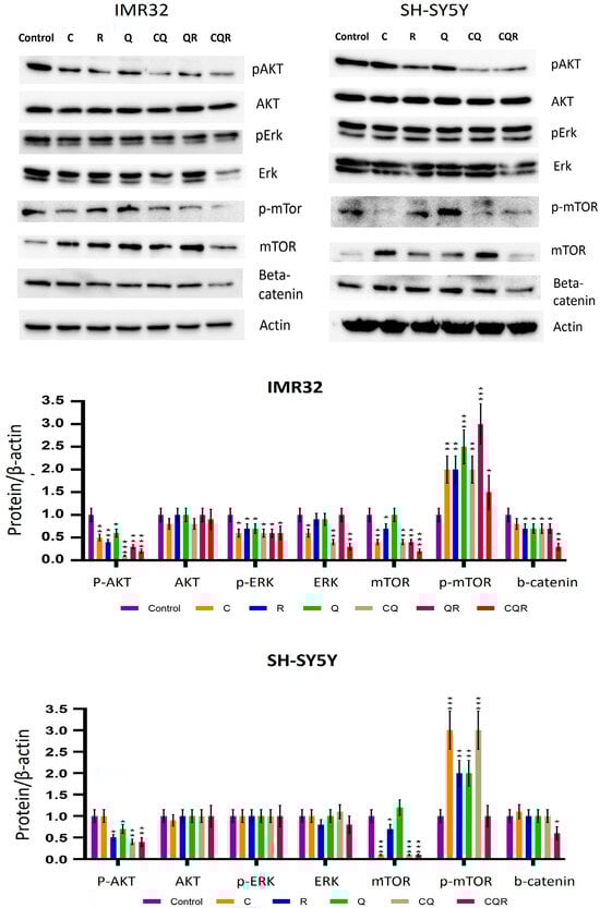 Polyphenols and their combinations inhibit AKT/mTOR, MAPK/ERK, and Wnt/β-catenin signaling pathways in neuroblastoma cell lines. Western blotting was carried out. The diagrams show the results of quantification performed using Image J software (Version 1.54p). Student’s t-test was used to determine pairwise statistically significant differences. Asterisks represent a significant difference in protein expression (* p ≤ 0.05; ** p ≤ 0.01; *** p ≤ 0.001). C—curcumin, Q—quercetin, R—resveratrol, CQ—curcumin with quercetin, QR—quercetin with resveratrol, and CQR—curcumin with quercetin and resveratrol.