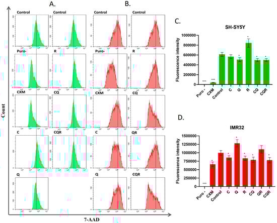 To do this, we treated IMR32 and SH-SY5Y cell lines with polyphenols and their combinations and applied a total protein biosynthesis kit based on the o-propargyl puromycin inclusion in the synthetizing proteins that is detected by flow cytometry. According to the results shown in Figure 10, CQ and CQR combinations effectively inhibited total protein biosynthesis, which aligns with their inhibitory activity on energy metabolism, metabolic enzymes, and the AKT/mTOR signaling pathways.