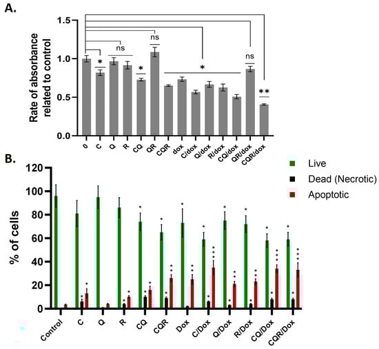 The results in Figure 11A,B show that all three polyphenols we tested made SH-SY5Y cells more sensitive to doxorubicin, and the combinations of CQ and especially CQR greatly increased their sensitivity, leading to a big drop in absorbance in the MTT test and a higher percentage of dead and apoptotic cells in the Annexin V/7-AAD test.