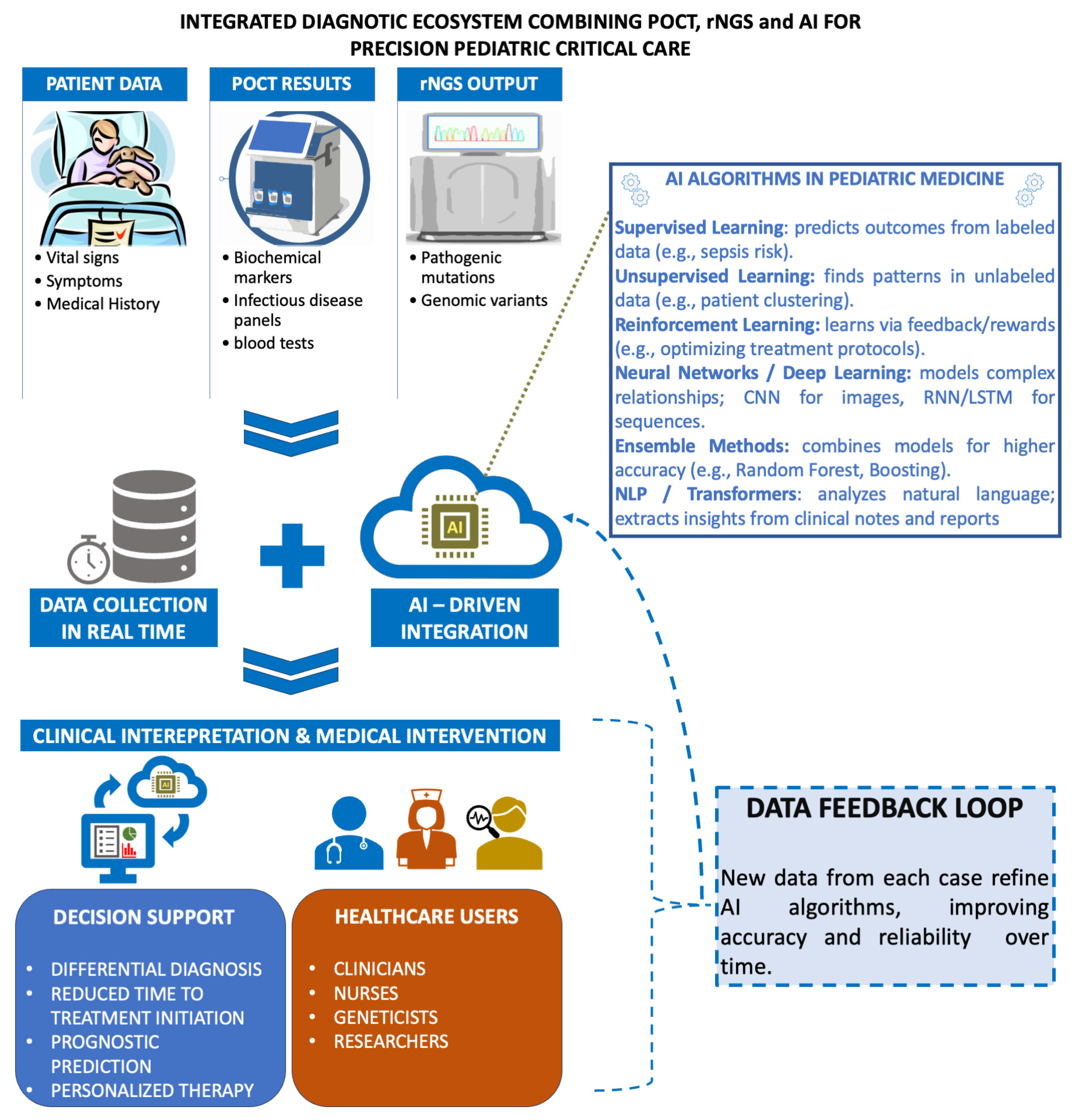Cianflone, A.; Coppola, L.; Primo, P.; Maisto, G.; Mastrodonato, F.; Di Palma, M.A.; Parasole, R.; Omodei, D.; Mirabelli, P. Point of Care Testing, Rapid Next Generation Sequencing and Artificial Intelligence in Pediatric and Neonatal Healthcare: A Narrative Review. Pharmaceuticals 2025, 18, 1721. https://doi.org/10.3390/ph18111721