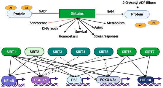 Sirtuins regulate histones, metabolic enzymes, and transcription factors such as p53, Forkhead box O (FOXO), Peroxisome proliferator-activated receptor gamma coactivator 1α (PGC-1α), and Nuclear factor-kappa B (NF-kB) to regulate cellular functions including DNA repair, metabolism, aging, survival, homeostasis, and stress responses (Figure 3). For instance, SIRT1 deacetylates FOXO, thereby activating it and influencing stress resistance and cell survival [,].