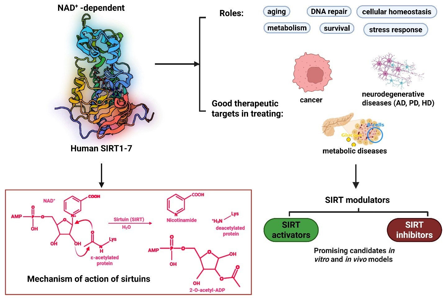 | SIRT1 | Nucleus | Strong deacetylase activity; regulates transcription factors | Aging, metabolism, inflammation |