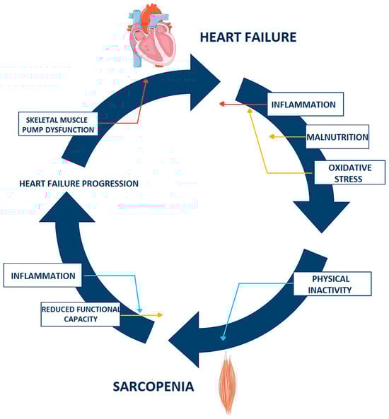 Mechanisms linking heart failure and sarcopenia. The figure was partly generated using Servier Medical Art (https://smart.servier.com), provided by Servier (Suresnes, France), licensed under a Creative Commons Attribution 4.0 International License (https://creativecommons.org/licenses/by/4.0/ (accessed on 5 November 2025)) and modified by the authors for the specific context of this review.