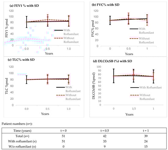(a–d): Lung function parameters with or without taking roflumilast (with standard deviation).