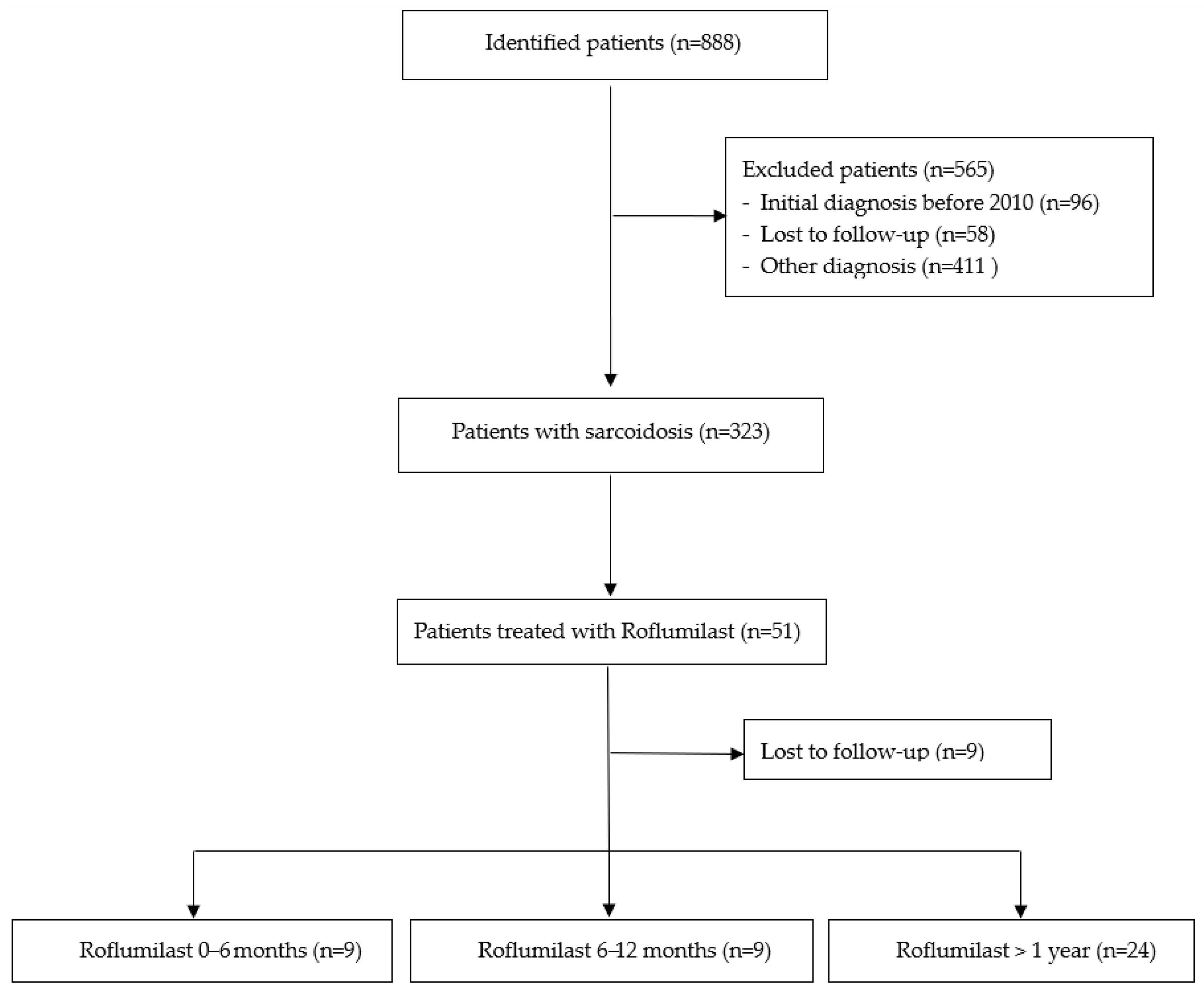 Feineis, M.E.; Terschluse, C.; Jouanjan, L.; Soriano, D.; Agarwal, P.; Schupp, J.; Müller-Quernheim, J.; Stolz, D.; Frye, B.C. PDE-4 Inhibition in Sarcoidosis Patients: A Retrospective Single-Center Analysis of 51 Patients. Pharmaceuticals 2025, 18, 1729. https://doi.org/10.3390/ph18111729