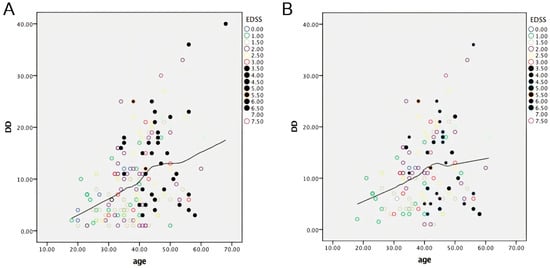 Scatter plots illustrating the correlation between age (years) and DD (years) with EDSS-labeled cases from the naive (A) and switcher (B) MS groups. EDSS cases with scores of 3.5 to 6.5, seen in bold, show a marked slope curve in both groups within the age range of 35–40. EDSS—Expanded Disability Status Scale.