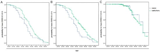 We also used Kaplan–Meier curves to evaluate patients who achieved an EDSS score status of 0.5–6.5 in both the naive and switcher MS groups. Specifically, in paired patients belonging to the two compared groups, the curve returns the estimated risk of disability at the same age. Figure 2A shows the significant inter-group difference that was found (p = 0.002). Stratification by EDSS ranges of 0.5– 3.5 and 3.5–6.5, applying the same statistical analysis, produced divergent results: significance was found in the first case (p < 0.001), while no significance was observed in the second (p = 0.714), as illustrated in Figure 2B,C.