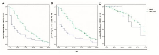(A) Kaplan–Meier curves showing the distribution of patients reaching an EDSS score of 0.5–6.5, (B) 0.5–3.5 and (C) 3.5–6.5 compared to the DD. Note: In (A,B) the lower curve represents the smaller proportion of naive patients reaching an EDSS score of 0.5–6.5 and 0.5–3.5 (p = 0.017, p < 0.001, respectively). No correlation was found in the EDSS score range of 3.5–6.5 (C) between naive and switcher groups (p = 0.331). DD—disease duration; EDSS—Expanded Disability Status Scale.