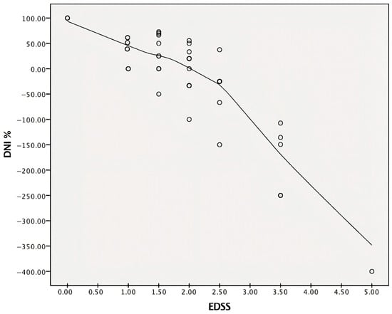 The particular performance of DMF, depending on the age and nature of the MS subgroup, is also confirmed by the DNI. In DNI analysis, the 69% difference in mean EDSS values between naive patients and switchers correlated with age (Figure 5) and DD. Notably, this measure rapidly declined with increasing disability, showing an inverse correlation with the same EDSS score (Figure 4).