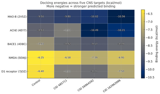 Crystal structures were obtained from the Protein Data Bank (PDB) based on resolution, ligandability, and the preservation of active-site architecture for five CNS targets: MAO-B (2V5z) [32], AChE (4EY7), BACE1 (4D8C) [45], NMDAR (5EWJ) [46], and dopamine D1 receptor (7JOZ) [37]. Receptors were prepared using AutoDock Tools (ADT) 1.5.6 by removing non-essential crystallographic waters while retaining conserved or structural waters as needed, adding polar hydrogens, assigning Kollman charges, and accounting for alternate conformations. Binding sites were delineated based on the coordinates of the co-crystallized ligands, and the site boundaries and contacts were visually confirmed using Discovery Studio Visualizer (DSV) version v21.1.0.20298. The binding-site grid centers (x, y, z; in Å) used for all docking runs were: AChE: (−14.108464, −43.832714, 27.669929); MAO-B: (51.886091, 156.452818, 28.559136); BACE1: (30.577200, 6.238225, 14.522375); NMDAR: (23.531216, −5.269588, −32.403902); and Dopamine D1: (−11.853296, −82.725852, −44.039481).