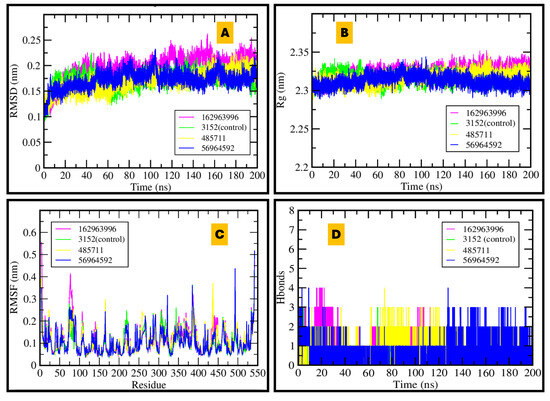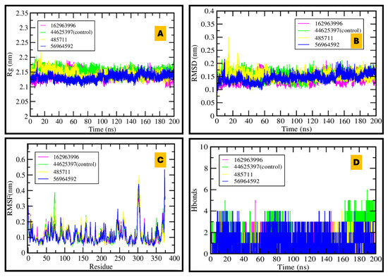 MDS of BACE1–ligand complexes over 200 ns: (A) Stable radius of gyration demonstrates compact protein structure; (B) RMSD plot shows good equilibration and dynamic stability; (C) RMSF indicates flexibility is restricted to specific regions; (D) Hydrogen bond plot reveals that 56964592 and control inhibitor maintain the most persistent protein–ligand interactions.