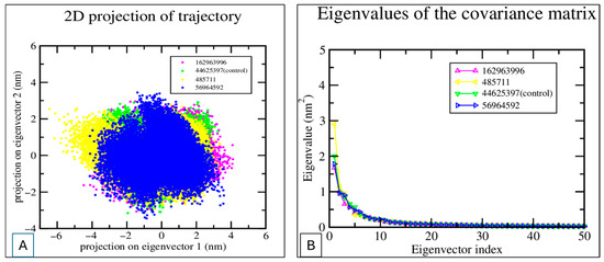 PCA of MD Trajectories. (A) 2D projection of trajectory snapshots onto the first two principal components (eigenvectors 1 and 2) for four systems. The distribution illustrates conformational sampling and structural diversity observed during simulations. (B) The eigenvalues of the covariance matrix for the four systems are plotted as a function of the eigenvector index.