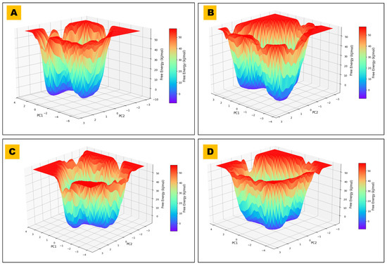 FEL of BACE1–ligand complexes. FELs are projected onto PC1–PC2 from 200 ns MD for the control and three hits. (A) FEL plot for BCHE1 in complex with 485711, illustrating the conformational stability and predominant energy basins observed during the simulation. (B) FEL plot for BCHE1 in complex with 44625397 (control compound), showing a broader and shallower energy landscape, suggesting increased conformational flexibility. (C) FEL plot for BCHE1 in complex with 56964592, highlighting a deep dominant energy minimum and restricted structural transitions reflecting a highly stable binding interaction. (D) FEL plot for BCHE1 in complex with 162963996, depicting a moderately deep central energy basin and intermediate conformational sampling characteristics.
