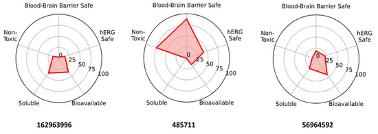 ADMET radar for the three intersection hits. Higher values indicate more favorable profiles. 162963996 and 56964592 exhibit strong BBB/bioavailability with hERG (±Ames) liabilities; 485711 shows lower hERG/Ames risk but lacks BBB permeability and solubility.