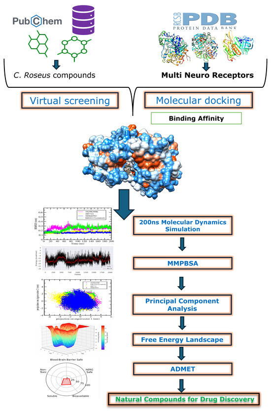 We developed a multi-target, structure-based discovery workflow to identify neuroprotective phytochemicals from C. roseus that could potentially reduce disability caused by neurodegeneration. The pipeline included: (i) selecting targets and preparing receptors for five CNS proteins—AChE, BACE1, MAO-B, NMDAR, and dopamine D1; (ii) curating and preparing a library of 318 metabolites from C. roseus; (iii) conducting structure-based virtual screening against each target using fixed grid centers and target-specific positive controls; (iv) performing cross-target intersection analysis to find compounds consistently ranking in the top 10 for all five receptors; (v) running 200 ns all-atom MD simulations to validate docking complexes for each target; (vi) executing BACE1-focused post-docking analyses, including essential dynamics, FEL mapping, and single-trajectory MM-PB/GBSA binding-free-energy estimation; and (vii) conducting in silico ADMET profiling of the three intersection hits to assess drug-likeness, pharmacokinetics, and toxicity risks. The workflow of this study is depicted in Figure 12. Docking scores served as comparative, not exact, indicators; differences ≤ 1.0 kcal·mol−1 were considered ties and resolved through MD interaction persistence (top 2–3 high-occupancy contacts), MM-PB/GBSA (mean ± SEM), and ligand efficiency (LE = −ΔGbind/Nheavy).