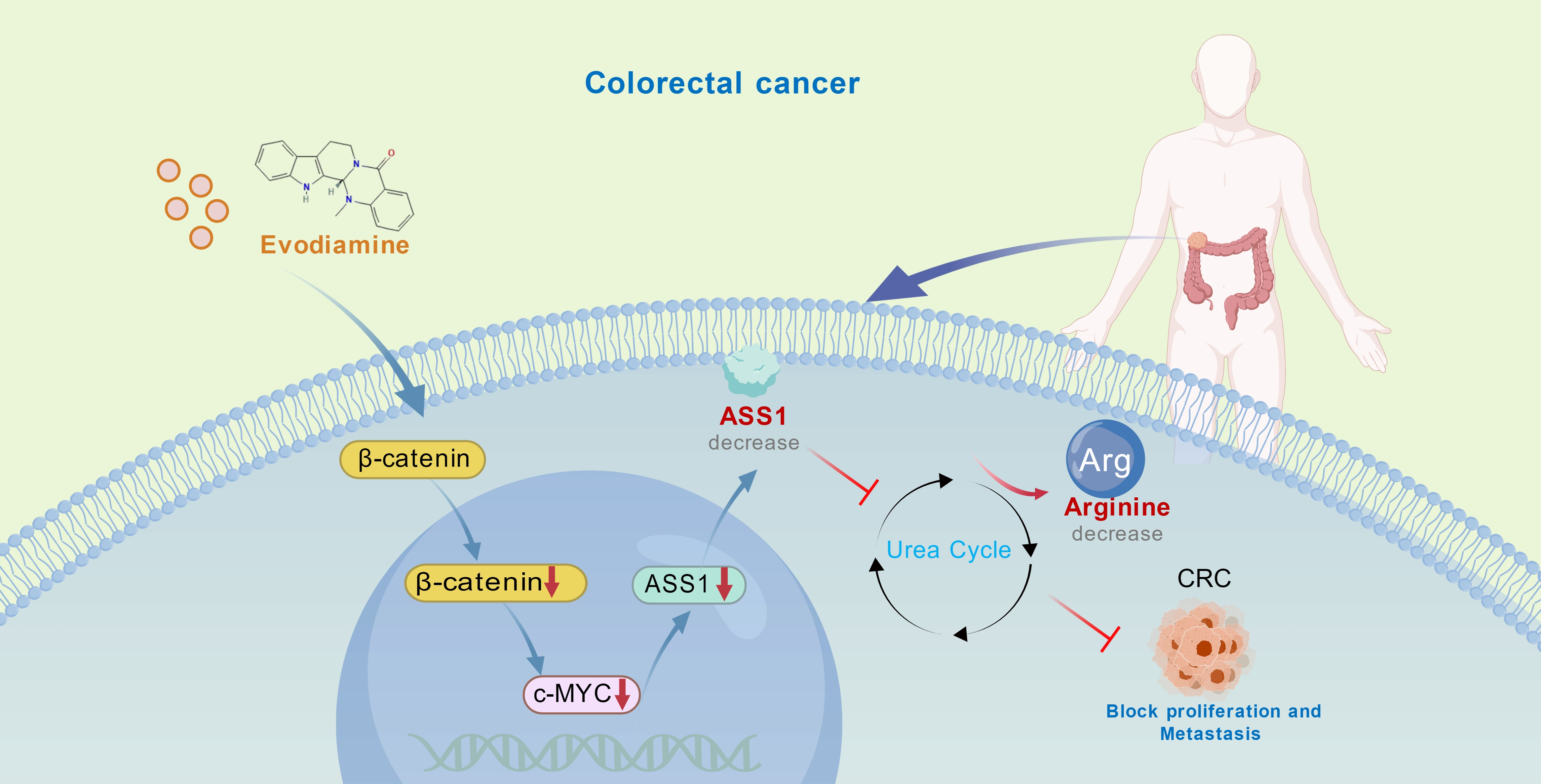 This study confirms that EVO inhibits the Wnt/β-catenin/c-MYC signaling pathway, which results in a decrease in ASS1 expression (the enzyme that limits the rate of arginine synthesis), leading to a reduced availability of intracellular arginine and ultimately hindering the proliferation and movement of CRC cells. This finding not only reveals a novel mechanism of action for EVO but also provides experimental evidence for “signal-metabolism” combined targeted therapy for CRC.