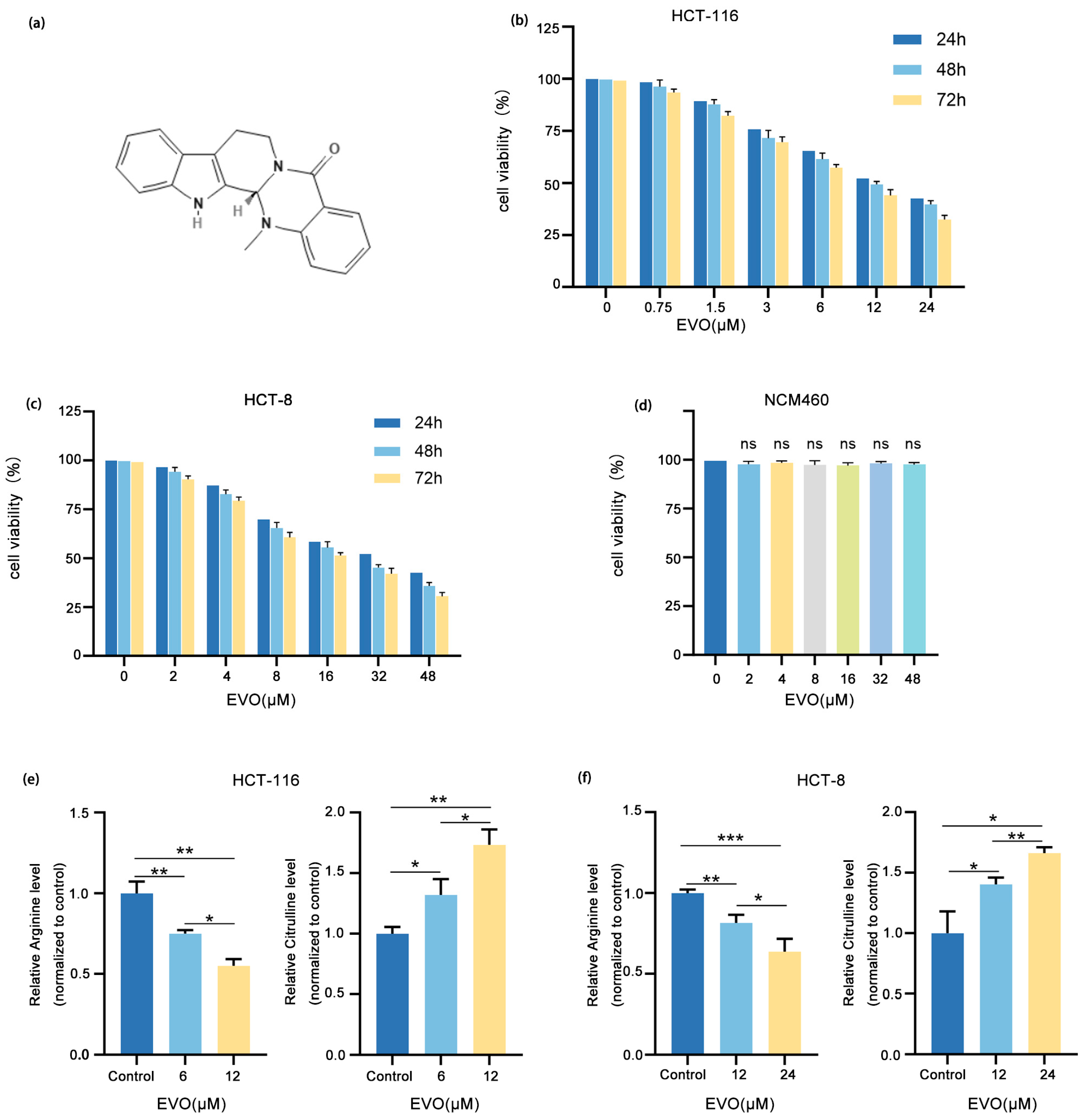 Figure 1. EVO Inhibits Arginine Synthesis Metabolism in CRC Cells. (a) Chemical structure of EVO. (b,c) The effect of EVO on the viability of HCT-116 and HCT-8 cells was evaluated by the CCK-8 assay. (d) The effect of EVO on the viability of NCM460 cells was evaluated by the CCK-8 assay. (e,f) The effect of EVO on their arginine synthesis metabolism of HCT-116 and HCT-8 cells were assessed by an ELISA kit. Statistical analyses used one-way ANOVA with Dunnett’s post hoc test; Data are presented as the mean ± SD, n = 3, ns: not statistically significant, * p < 0.05, ** p < 0.01, *** p < 0.001.