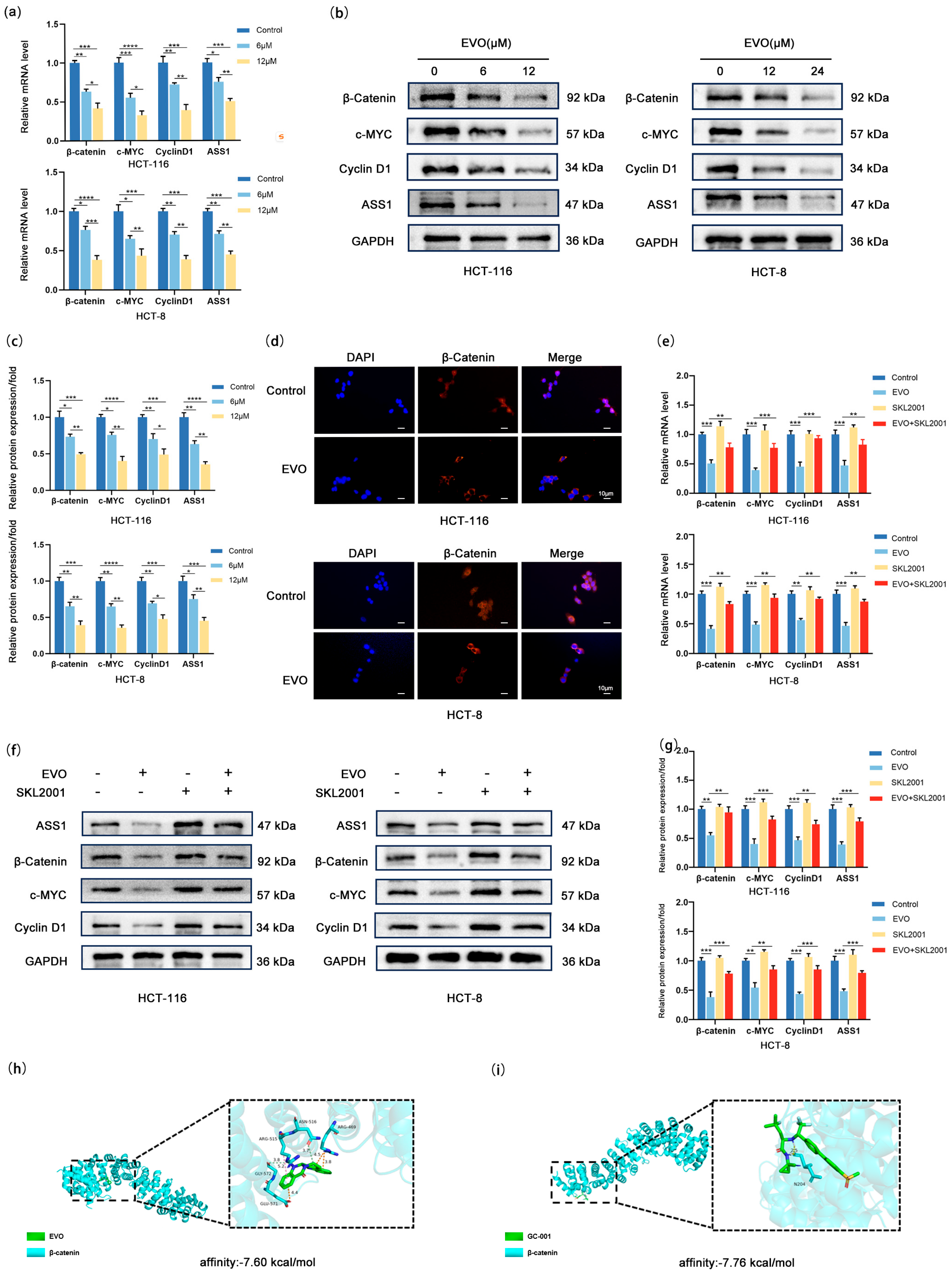 Figure 4. EVO Regulates ASS1 via the Wnt/β-Catenin/c-MYC Pathway in CRC Cells. (a) RT-qPCR detected mRNA levels of β-catenin, c-MYC, Cyclin D1, and ASS1 in HCT-116 and HCT-8 cells treated with EVO; (b,c) Western blot measured protein levels of β-catenin, c-MYC, Cyclin D1, and ASS1 in EVO-treated HCT-116 and HCT-8 cells; (d) Immunofluorescence staining observed subcellular localization of β-catenin in EVO-treated HCT-116 and HCT-8 cells (Scale bar: 10 μm); (eg) RT-qPCR and Western blot analyzed mRNA and protein levels of β-catenin, c-MYC, Cyclin D1, and ASS1 in cells co-treated with EVO and SKL2001; (h) Three-dimensional visualization of EVO docking with β-catenin; (i) Three-dimensional visualization of β-catenin docking with its positive inhibitor GC-001; Data are mean ± SD, n = 3. Statistical analyses used two-tailed Student’s t-test or one-way/two-way ANOVA with post hoc tests; * p < 0.05, ** p < 0.01, *** p < 0.001, **** p < 0.0001.