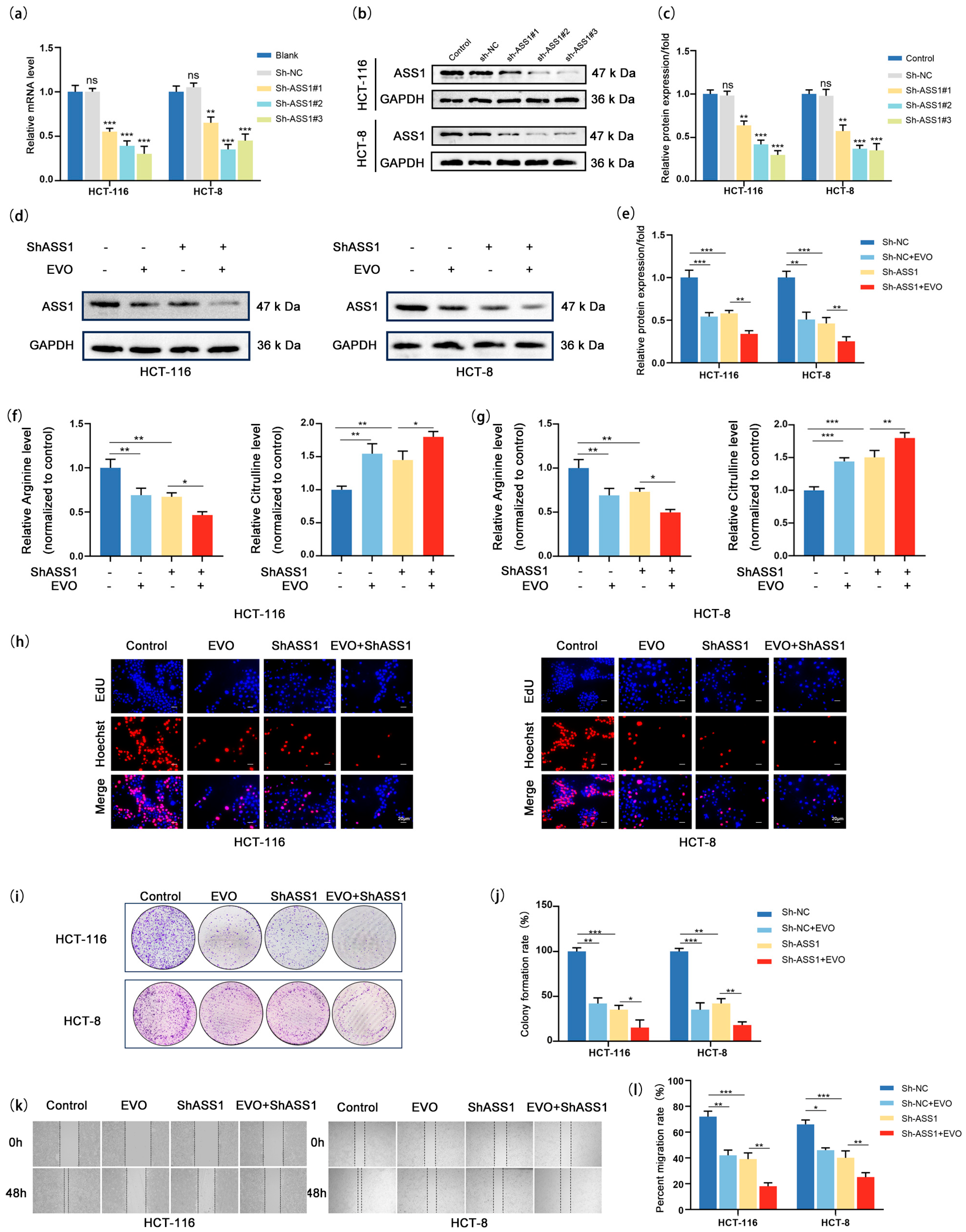 Figure 5. ASS1 Knockdown Synergizes with EVO to Inhibit Arginine Synthesis and Malignant Phenotypes in CRC Cells. (a) RT-qPCR detected ASS1 mRNA in HCT116/HCT-8 cells transduced with ShNC/ShASS1#1-3; (b,c) Western blot and quantification assessed ASS1 protein after knockdown; (d,e) Western blot and quantification measured ASS1 protein in four groups; (f,g) Intracellular arginine and citrulline levels in four groups were detected to evaluate arginine synthesis; (h) EdU assay showed cell proliferation (Scale bar: 20 μm); (i,j) Colony formation assay and quantification analyzed clonogenicity; (k,l) Wound healing assay and quantification assessed migratory ability. Data are mean ± SD, n = 3. Statistical analyses used two-tailed Student’s t-test or one-way/two-way ANOVA with post hoc tests; ns: not statistically significant, * p < 0.05, ** p < 0.01, *** p < 0.001.