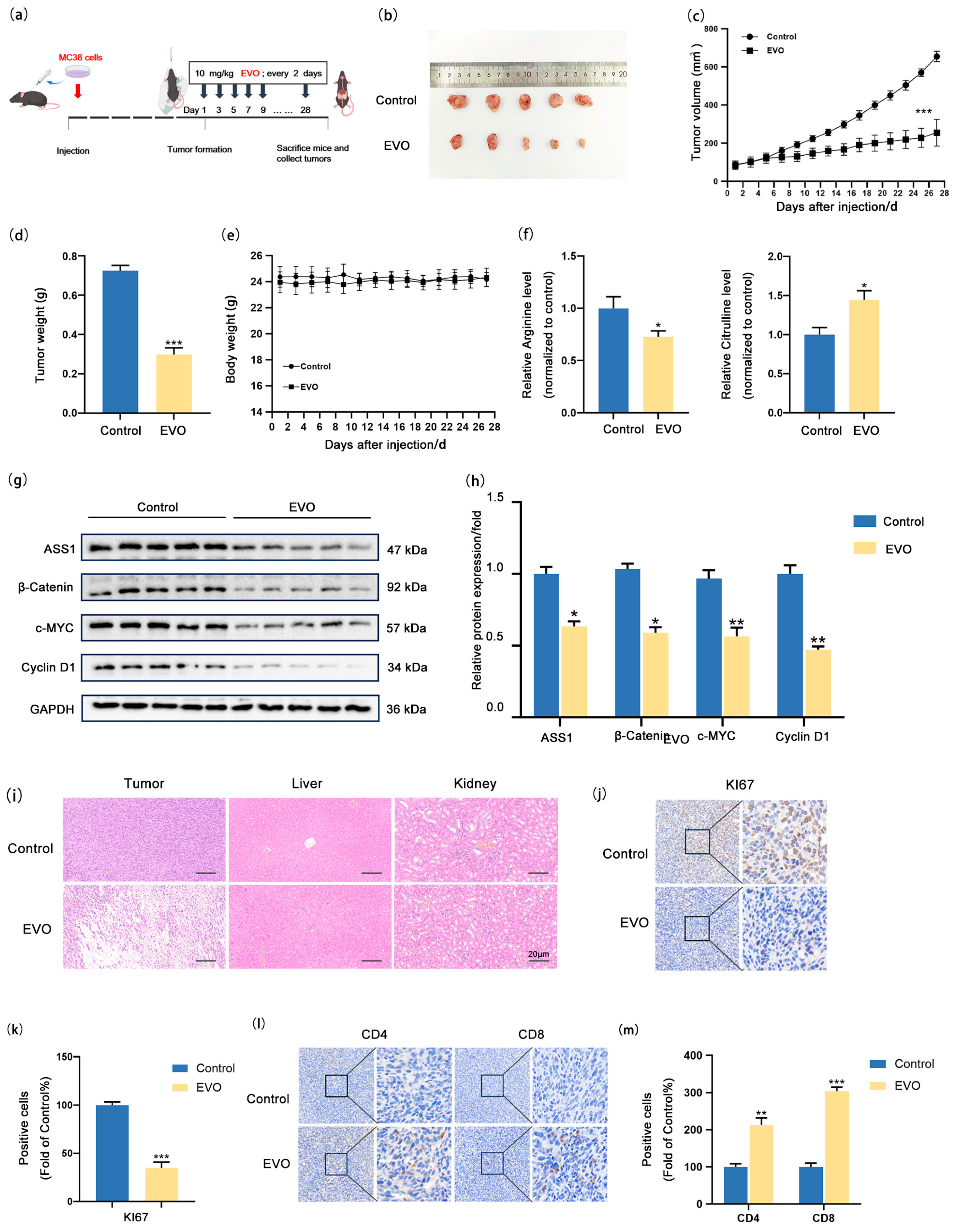 Figure 6. EVO Inhibits Arginine Synthesis in CRC in vivo. (a) Syngeneic tumor allografts were established by subcutaneously implanting MC38 cells into C57BL/6J mice; (b) Images of tumor allografts; (c) Tumor volume changes, (d) tumor weight, (e) body weight; (f) ELISA detected arginine and citrulline levels in tumor tissues; (g,h) Western blot measured ASS1, β-catenin, c-MYC, and Cyclin D1 protein in tumor tissues; (i) H&E staining of tumor, liver, and kidney tissues (Scale bar: 20 μm); (j,l) IHC detected Ki67 expression and CD4+/CD8+ T cell infiltration in tumor tissues; (k,m) Quantification of Ki67 and T cell infiltration. Data are mean ± SD, n = 5. Statistical analyses used two-tailed Student’s t-test or one-way/two-way ANOVA with post hoc tests; * p < 0.05, ** p < 0.01, *** p < 0.001.