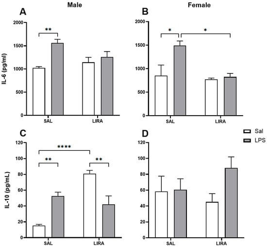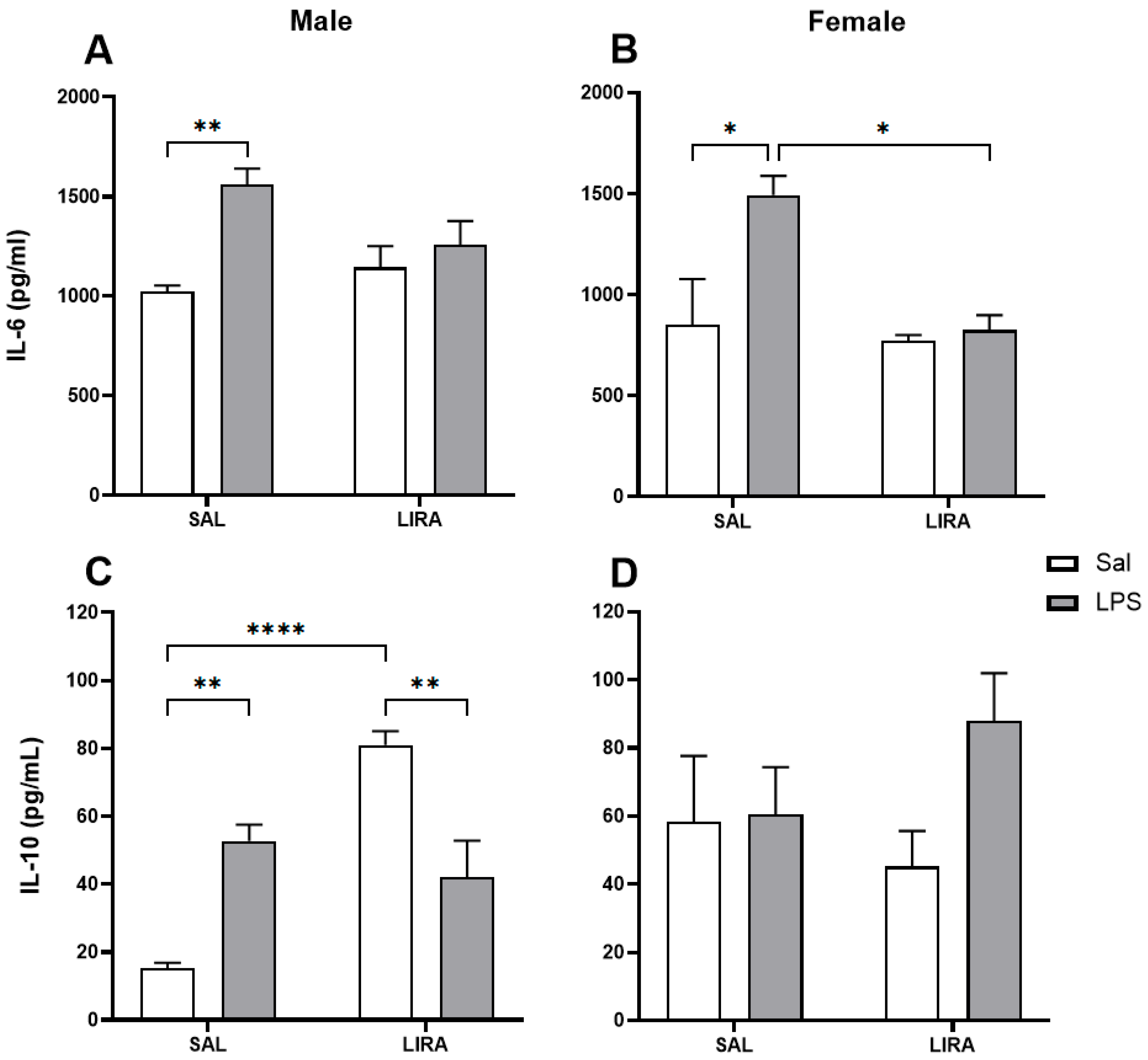 2.3. Effect of Post-Treatment with LIRA on Circulating IL-6 and IL-10 Levels