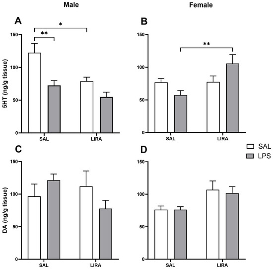 2.5. Changes in 5-HT and DA Levels in the Hypothalamus by LIRA