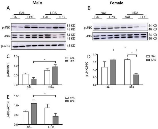 2.6. Sex-Specific Modulation of Hypothalamic JNK Signaling by LIRA