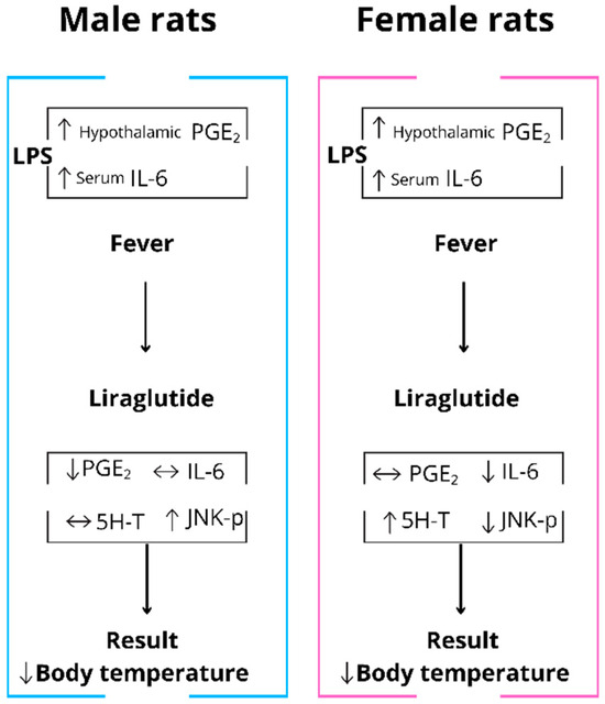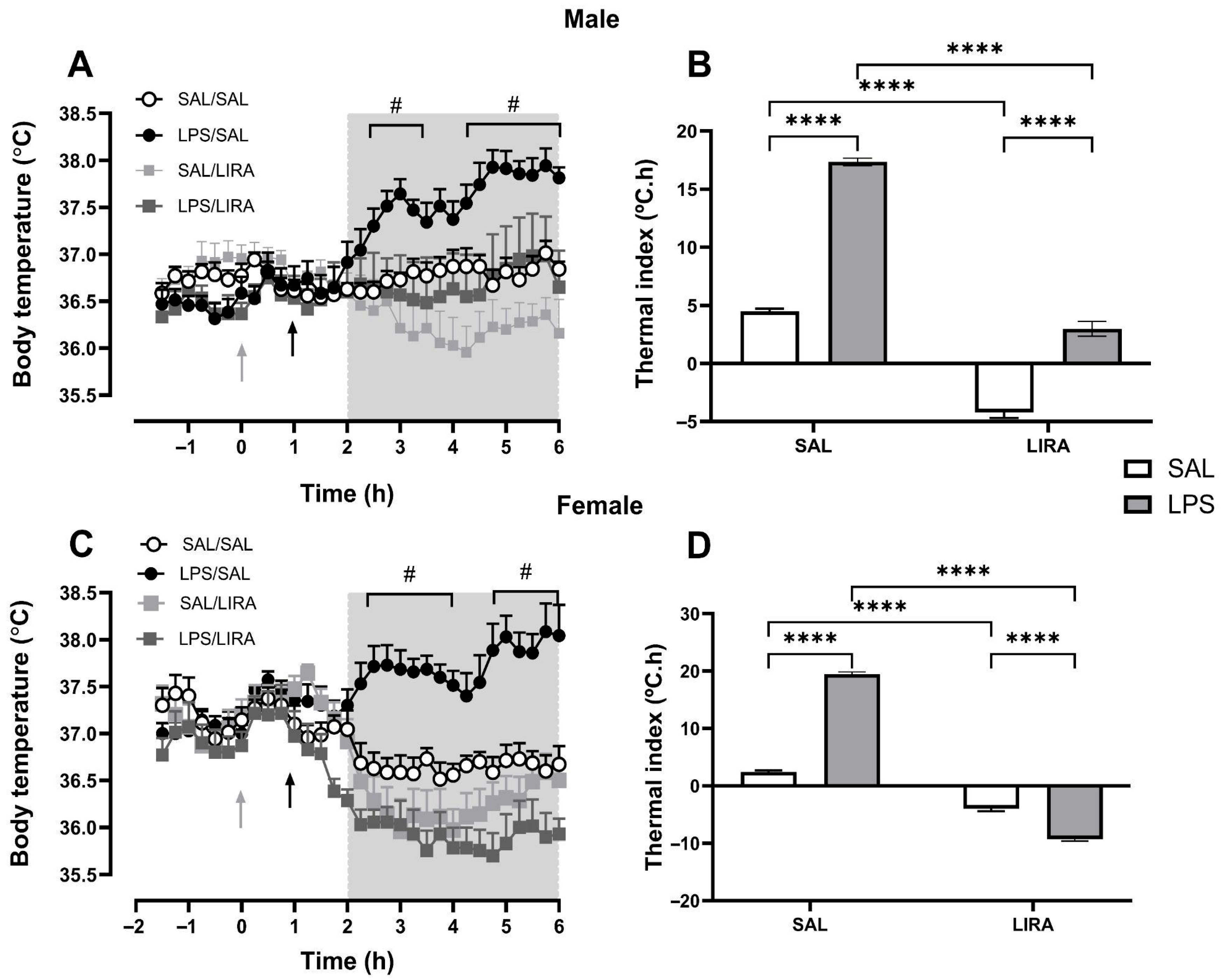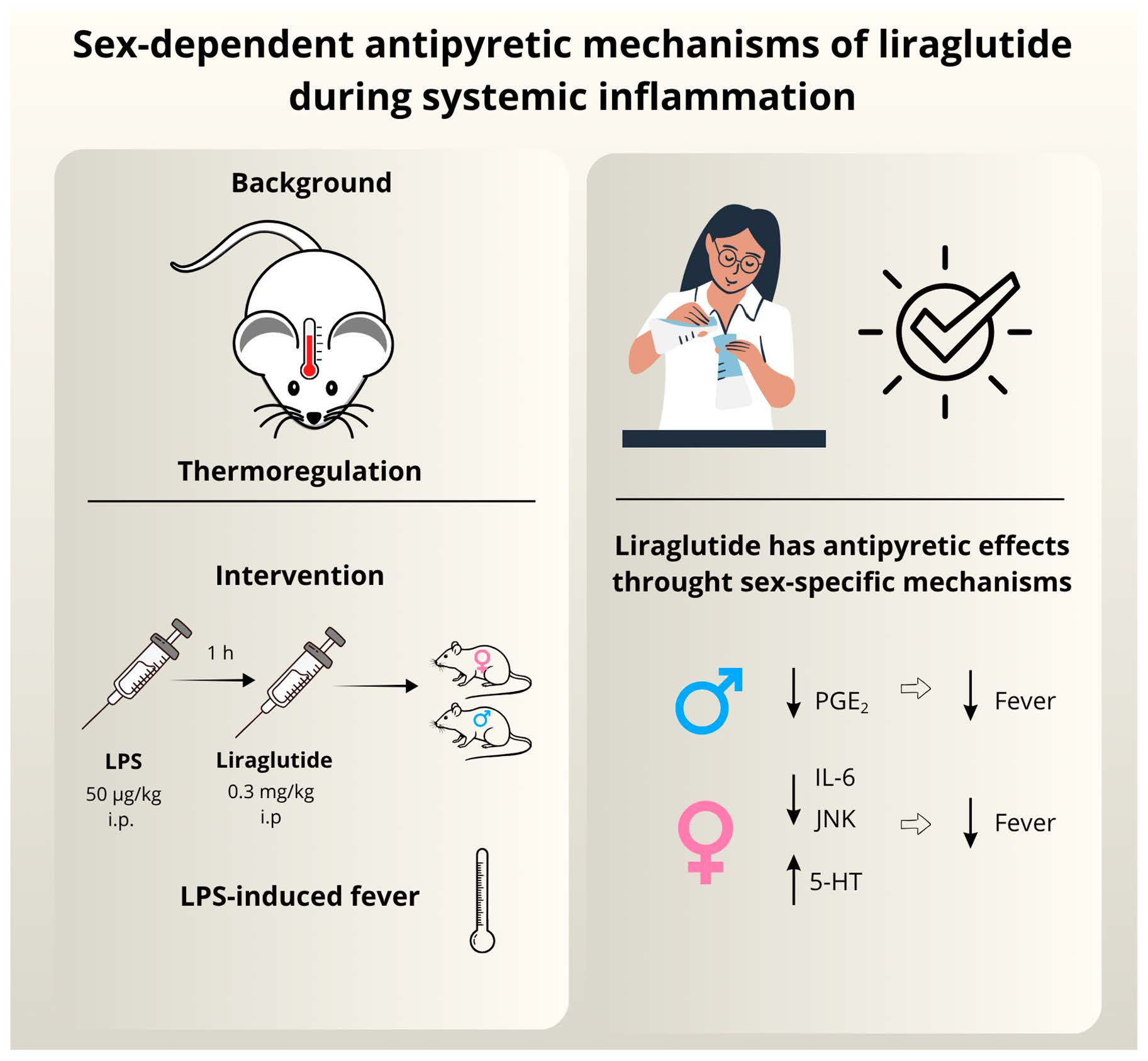 de Sousa GLS, da Cruz EKM, de Aguiar SCR, Nascimento APLd, Gomes BRB, Londe ABR, Gonçalves LJF, Royer C, Costa RA, Zampronio AR, et al. The GLP-1 Analog Liraglutide Reduces Fever Through Sex-Dependent Neuroinflammatory Modulation. Pharmaceuticals. 2025; 18(11):1738. https://doi.org/10.3390/ph18111738