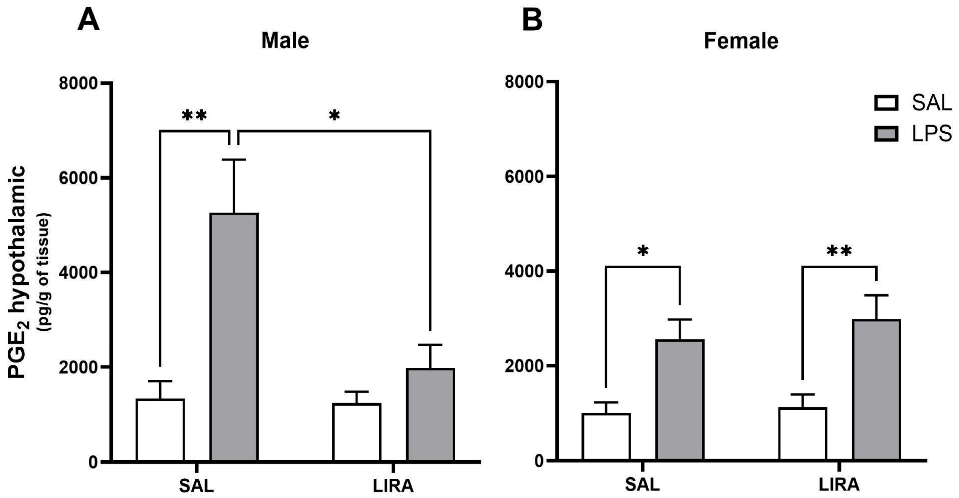 2.2. Effect of Post-Treatment with LIRA on Hypothalamic PGE2 Production