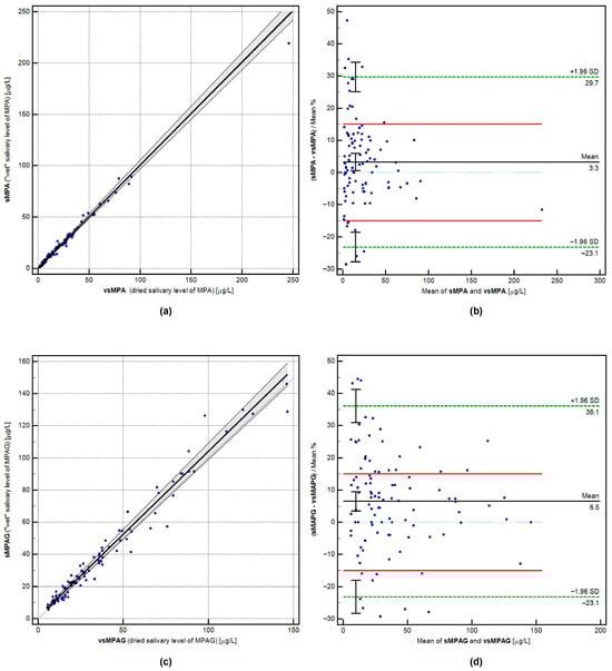 Visualization of cross-validation calculations for paired results (n = 100) of MPA and MPAG concentrations in wet and dried saliva samples. Panels (a,c) show Passing-Bablok regression for MPA and MPAG relationships (full description of comparison on plot axis). Panels (b,d) display Bland-Altman plots with the mean percentage bias marked, the standard deviation range (green dashed lines), and the analytical limit of agreement (LoA, red solid lines).
